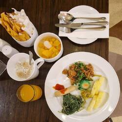 Gegen 8 Uhr klopfte der Frühstücksservice an unsere Tür. Mit viel Sorgfalt wurde unser Frühstück direkt im Haus vorbereitet. Frisches Obst, warme Speisen, aromatischer Tee – ein echter Genuss in tropischer Atmosphäre.