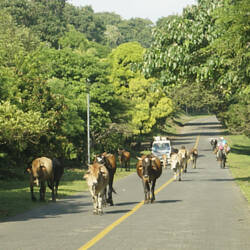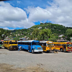 Busfahren in Nicaragua macht großen Spaß - es wird mit alten amerikanischen Schulbussen, den sogenannten Chickenbussen, gefahren. Während draußen die grünen Bananen- und Kakaoplantagen vorbeiMeer informatie