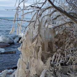 Spaziergang bei wunderschönen Sonnenschein aber lausiger Kälte. Wind immer noch von NO. Gefühlt - 10 Grad. Wind und Wellen haben schöne Eisskulpturen gezaubert.