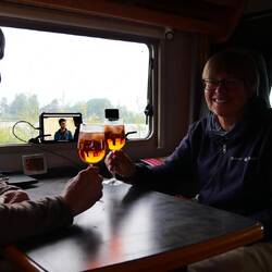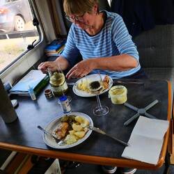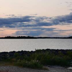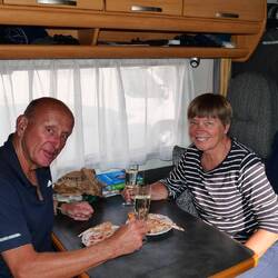 Ich hatte wieder einen bestimmten Stellplatz in park4night gefunden, der unser heutiges Ziel sein sollte. Der Platz lag sehr idyllischdirekt am Wasser und wir bekamen noch einen Stellplatz in erster Reihe direkt neben einem ähnlichen LMC Liberty. Wir tauschten unsere Erfahrungen aus. Das Wetter war sehr labil, was einen interessantes Wolkenspektakel zeigte. Wir wollten endlich mal wieder grillen...Würsten und Filetsteak aus dem Gefrierfach. Es wurde wieder ein Festessen zu dem es wieder einen köstlichen frischen Salat gab. Um 22:15 gab es dann doch noch einen Sonnenuntergang zu sehen.