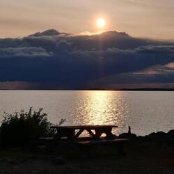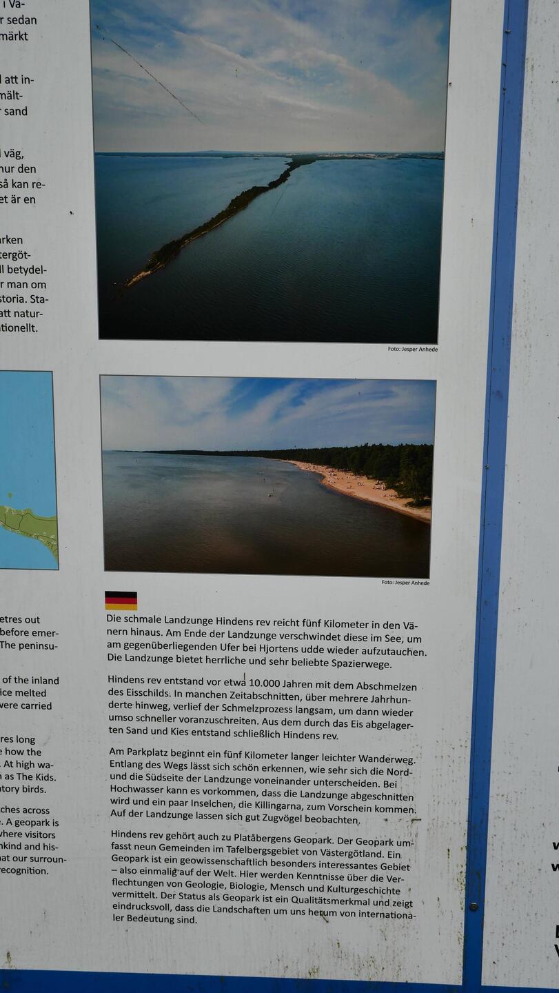Um 10 Uhr haben wir unseren tollen Stellplatz in Spiken verlassen. Wir wollten uns als nächstes die 5 km lange und nur wenige Meter breite Landzunge Hindens Rev ansehen. Es ist als Naturreservat ausgewiesen und es wurde eine 8 Kilometer lange Wanderung bis die letzten Steine im Vänern verschwanden. Wir beobachteten einen Schwarm großer Fische, die meines Erachtens an die Spitze zur Eiablage gekommen sind. Um welche Gattung es sich dabei handelt, konnte ich auch mit viel Geduld nicht erfahren. Der Abstecher hierher hatte sich auf jeden Fall gelohnt.Read more