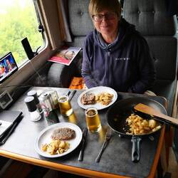 Also hat Petra 2 Maschinen Wäsche gewaschen und mit mir einen Gang zu dem Badeplatz gemacht. Endlich wieder Salzwasser mit Seetang und Muscheln. Da Petra wegen der Wäsche wieder zurück musste, bin ich allein eine 10 km Komoot Wanderung gegangen. Der Anfang war vielversprechend mit Kraxeln und schöner Aussicht. Dann ging es aber an der Straße entlang, was weniger schön war. Als ich zurück kam, hatte Petra schon frischen Dorsch für das Abendessen eingekauft. So verging der Nachmittag und wir freuten uns auf den gebratenen Dorsch. Leider trübte den Tagesverlauf dann noch ein Defekt der Toilettenspülung. Wahrscheinlich werden wir für den Rest des Urlaubs mit der Wasserflasche spülen müssen....gibt Schlimmeres 😉
