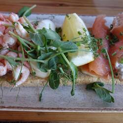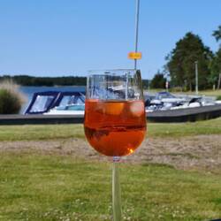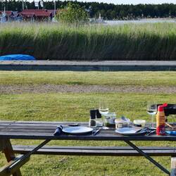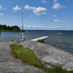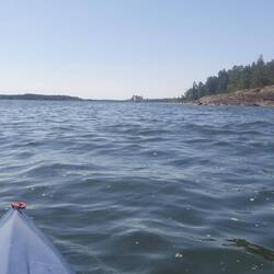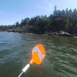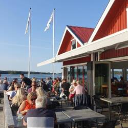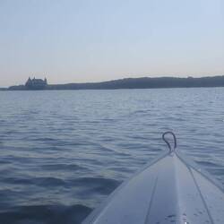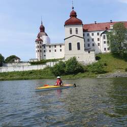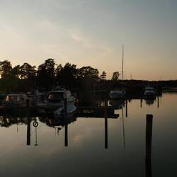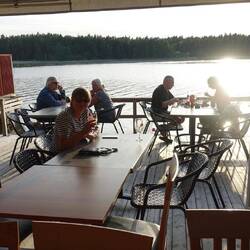 Als wir zurück waren machte ich mein Kajak klar und paddelte entlang der Schären noch einmal zum Schloss. Das Wasser war spiegelglatt und es hat viel Spaß gemacht. Auch an einmal Fischadlerhorst bin ich vorbeigekommen. Um 17:30 Uhr war ich zurück und wir entschieden heute Essen zu gehen. Das Restaurant, indem wir heute morgen unser Eis gekauft haben, verfügt über eine schöne Aussenterrasse, auf der wir Fish and Chips und einen Burger bei lecker gezapften Bier aßen. Das Kajak bleibt noch unten, denn es könnte durchaus sein, dass wir hier noch einen weiteren Tag verbringen.