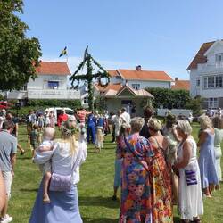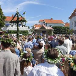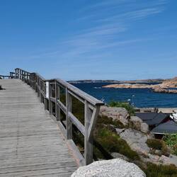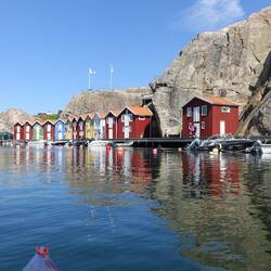 Erwacht bei blauen Himmel und Windstille. Nach dem Frühstück holten wir mein Kajak vom Dach. Petra hatte keine Lust zu paddeln und so nahm ich mir vor, nach Smögen zu paddeln. Ein Unterfangen, was nur bei optimalen Wetterbedingungen angegangen werden sollte. Ich hatte Glück und erreichte nach einer Stunde Smögen. Viel Trubel heute zum Mittsommer. Viel Schiffsverkehr dort hin und auch die berühmten 600m Hafenpromenade waren gut besucht. Am Ende des Hafens dann das Highlight, Smögenbryggan, die bunten Fischerhäuser, das bekannte Fotomotiv in Schweden. Nach gut 2 Stunden war ich mit Rückenwind dann wieder am Campingplatz. Es blieb nur wenig Zeit, denn um 15 Uhr wollten wir mit dem Fahrrad nach Fisketången fahren um bei den Feierlichkeiten zum Mittsommer dabei zu sein.