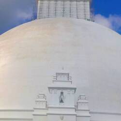 Approaching Sandahiru Seya, the gentle rustle of leaves provided a soothing backdrop to our contemplation. The stupa's pristine white dome exuded an air of tranquility, contrasting with the vibrant greenery that embraced it.