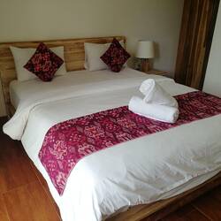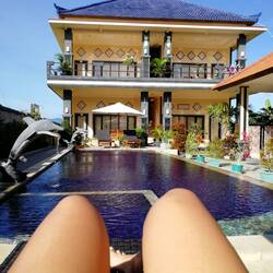 Dann hört es auf zu regnen und wir setzen unsere Fahrt fort. Als wir in Lovina ankommen, suchen wir uns eine Unterkunft. Das erste Mal verfahren wir uns und landen irgendwo in einem Dschungelabschnitt am Meer, wo es nicht weiter geht. Also drehen wir um und fahren wieder in die Stadt. Also hier gibt es schon ein paar Restaurants und Bars, aber das Flair kommt irgendwie nicht so rüber. Hier sind auch mehr ältere Leute unterwegs, hab ich das Gefühl und der Strand, ja der ist schon schön, aber ich habe mehr erwartet. Hier haben viele Fischerboote angelegt und der schwarze Sandstrand wird von einer Mauer zur Straße, die wir gerade entlang fahren getrennt. Wir sehen uns Unterkünfte an, die für 20€ die Nacht sind, was schon recht teuer ist, aber hier gibt es nicht recht viel günstigeres. Aber nachdem wir uns das 3e Homestay angesehen haben, haben wir unseres gefunden :) Wir lieben es. Das Zimmer ist sehr sauber und wir haben einen tollen Pool, mit einer schönen Anlage. Wir genießen den Aufenthalt hier sehr und entspannen noch ein bisschen, bevor es morgen wieder weiter geht.Baca lagi