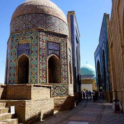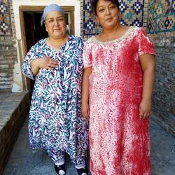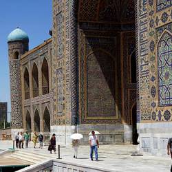 Arrive mid afternoon and after a refresh head out on our city orientation. We get our first glimpse at the Registon, three glorious tiled Madrrassas that comprise one of the main squares. There is a musical festival going on, so the square is closed now but we look over it and watch the rehearsal with dancing performers filling the square. It's really quite a spectacle with the shear mass of the buildings. We take a short ride to our restaurant, Planken, and are seated outside the restaurant in a 19 th century building. I have pita, toasted with cheese and garlic, lentil soup served with cream and an orange wedge and chicken Kiev, all delicious. Next day, wake up for our city tour. We start at Amir Khan's tomb. An impressive entranceway leads to a courtyard and the fluted dome of the tomb. They're it's a crypt under ground that holds the bodies but there are gravestones on the main floor to view. Amir Khan has a blackish Jade Stone that is the 2nd largest carved Jade block in the world. He is flanked by his grandson, who was his chosen heir but was killed young, and other relatives. The highest and most impressive Stone belongs to Timur's teacher. There is an unmarked Stone somewhat separate from the others that is for the Sufi devoted worshipper who would worship at the gravesite. Next we walk through the bazaar which is bustling. And come out on one side of the Registon, walking along it past the Bibi Mosque and some higher end souvenir shops. We enter the Registon and learn of the Madrrassas, schools for young men that were built in the 14-15 hundreds. We tour each, many of the small individual study Chambers are now artisan shoppes. There are impressive mosques and inner courtyards. Really all stunning. While listening to our guide, a group of local women beckon me over to join them for a picture. Members of our group have all experienced being asked to pose with locals for their photos. We finish the tour and some of us stick back to visit one of the shops and buy silk robes. We eat lunch at a tea House, Uzbeck spaghetti - noodles with a vegetable tapinade. Then we walk to the alley of mausolems, along the old graveyard, up a steep flight of stairs, there is an equisitivley tiled set of individual mausolems to members of the royal court. Individual antechamber are all unique, there is an open octagonal one as well. Beck down, catch a taxi with an animated driver who shouts places at us, Brooklyn, New York, Moscow, Tashkent ..A short rest and we are of to a local house for a Plov demonstration and dinner. Plov is the national dish, it's a layered dish of carrots, garlic, spices, rice and meat. We are seated at a table in the houses inner outdoor courtyard, surrounded by a small herb and vegetable garden. We are served a feast - eggplant fritters, pickled eggplant, carrot salad, fresh greens, soft cheese spread with bread, samosa of meat and zucchini then Plov. Delicious. A quick stop where we started to see Timur's tomb light up at nightRead more