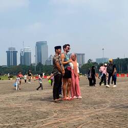 Am nächsten Tag ging es nach dem Frühstück Richtung Stadt. Es ist zwar immernoch sehr heiß hier aber keine drückende Hitze und deutlich angenehmer als in Vietnam. Wir marschierten zum National Monument und wollten dort ein schönes Foto von uns machen. Also fragte ich eine Indonesierin, die total nervös wirkte und dann ging es los. Sie machte zwar 2-3 Bilder aber danach wollte die ganze Familie Fotos mit uns. Egal ob einzeln, nur die Frauen oder mit allen. Und das nicht nur diese eine Familie sondern auf dem ganzen Gelände kamen immer wieder Leute auf uns zu und wollten Bilder mit uns machen. Total verrückt aber wir sind ja für jeden Spaß zu haben und sind halt jetzt bei irgendwelchen Indonesiern verewigt worden. Passt auch 😂