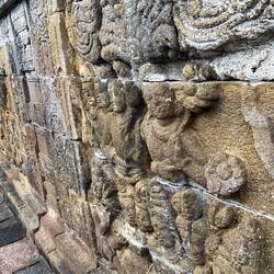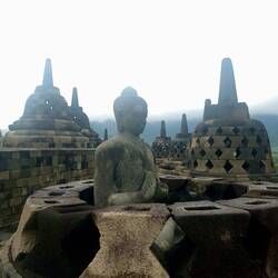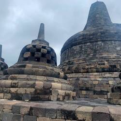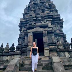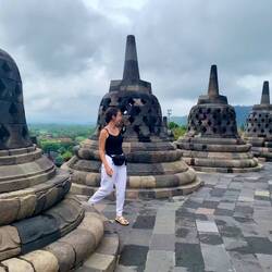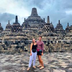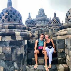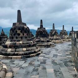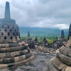 Schon gestern bemerkten wir, dass man in Indonesien alles etwas früher buchen muss, denn viele gute Transfermöglichkeiten sowie Hostels und Touren sind bereits ausgebucht. Angeblich wegen den Ferien. Aus diesem Grund kamen wir heute Nacht auch erst um 01:30 in Yogyakarta an. Wir gingen direkt schlafen und starteten dann mit wenig Schlaf in die heutige Tour. Da alles ausgebucht war, mussten wir wohl oder übel das teure Premiumticket buchen. Im Nachhinein waren wir froh drum, denn ein Fahrer holte uns morgens zu unserer Wunschzeit ab und fuhr mit uns zum Tempel Borobudur. Dort angekommen, bekamen wir schicke Schlappen und einen tollen Guide. Da wir das Luxusticket hatten, durften wir bis fast auf die Spitze des Tempels und erfuhren sehr viele interessante Dinge über die buddhistischen aber auch hinduistischen Bauteile. Der Tempel stammt aus dem 8.Jahrhundert und ist noch sehr gut erhalten. Damit das so bleibt, ist die Besucherzahl (vorallem auf der Spitze) begrenzt worden. Unser Guide erzählte uns sehr viel über den Buddhismus und wir waren beeindruckt! Nach einer guten Stunde war unser Zeitslot vorbei und wir mussten wieder runter. Unten wartete schon das persönliche Shuttle, Snacks, Souvenirs und wir durften die Schlappen behalten - Premiumticket hat sich gelohnt 👍🏼