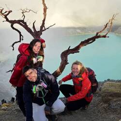 Gesetzlich muss man einen „Gesundheitstest“ machen, um auf den Vulkan zu dürfen. Wir wurden da aber irgendwie durch gewunken. Allerdings kamen wir nicht um die Gasmaske drum rum. Grund dafür ist, dass wir uns damit vor den austretenden Schwefelgasen auf dem Vulkan schützen müssen. Auch eine Maske für die Augen mussten wir anziehen. Wir konnten die aktiven Minenarbeiter beobachten und das Highlight des Vulkans ist das sogenannte einzigartige „blaue Feuer“. Da hat es dann aber schon in den Augen bzw. beim Atmen gebrannt. Und auch der Massentourismus erlaubte uns 2-3 Fotos, schob uns dann aber weiter. Danach ging es ganz hoch auf über 2700m um den Sonnenaufgang sowie den See im Krater zu sehen. Wir hatten Glück, dass keine Wolken da waren und die Sicht wirklich unglaublich gut war! Czytaj więcej
