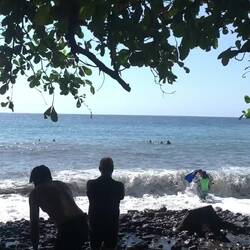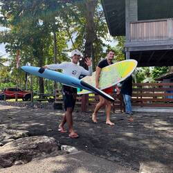 Ausgeschlafen und mit einer Mega Aussicht auf den „Jungle“ starteten wir in den nächsten Tag. Jedoch war es nachts unerwartet kalt und dann lief die Nase wieder. Naja, was hilft dagegen? Nasenspülung mit Salz und die gibt es hier ja Glücklicherweise wie Sand am Meer 😉 Am Strand angekommen, liehen wir uns 3 Surfbretter aus und während Bine & Jazzy (eine aus dem Hostel) sich an die großen Wellen wagten, entschieden Robin & ich uns für einen Surflehrer. Wir waren ja schonmal in Portugal surfen, aber zum wieder warm werden kann ein Surflehrer nicht schaden. Schlussendlich hat es wirklich Spaß gemacht & ich hatte das Gefühl, der Knoten ist geplatzt und ich konnte die meisten Wellen stehen/surfen 🏄 Allerdings sind am Strand viele Steine und wir zogen uns ein paar leichte Schnittwunden zu, aber alles halb so wild. Am nächsten Tag hatte Robin nochmal einen Surflehrer gebucht. Bine & ich entschieden uns für Sonne tanken & Fotos von Robin machen, bevor wir uns alle 3 eine Massage gönnten 💆🏽♀️