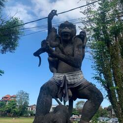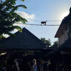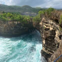 Am nächsten Morgen wurden wir diesmal nicht von einem Muezzin sondern von gefühlt 15 kreischenden Hähnen geweckt. Ich bin mir sicher, dass die hier noch Hahnenkämpfe veranstalten und unser Nachbar scheint die Viecher wohl zu sammeln. Zum Glück wollten wir eh um 7:30 los zum berühmten Kelingking Beach. Dort angekommen, entdeckten wir erstmal die hässliche Baustelle, bei der momentan der noch hässlichere Aufzug gebaut wird. Da so früh morgens aber noch keine Touri-Gruppen da sind, konnten wir noch gut Bilder machen, bevor wir uns an den Abstieg wagten. Der ist wirklich nur was für geübte. Denn irgendwann klettert man nurnoch die Steine runter und kann sich lediglich an ein paar Seilen festhalten. Unterwegs muss man aufpassen, dass die frechen Affen einem nichts klauen. Unten angekommen ist die Strömung so stark und die Wellen so hoch, dass schwimmen / Baden wirklich lebensmüde ist. Natürlich gibt’s ein paar Deppen, die es trotzdem probieren wollten. Für uns ging es dann aber wieder hoch und zum nächsten Spot. Die Straßen sind hier miserabel. Von der Breite sollte hier nur in eine Richtung gefahren werden und natürlich fahren die hier mit fetten SUV‘s rum. Außerdem sind hier überall böse Schlaglöcher und es geht teilweise steil hoch und um enge Kurven. Robin ist wirklich gut gefahren aber Spaß macht es ihm hier nicht.
