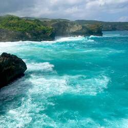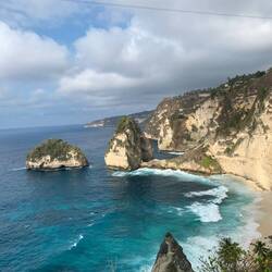 Am letzten Tag hätte ich die Hühner vom Nachbar, die an meiner Mutation zum Frühaufsteher schuld sind, am liebsten mal persönlich kennengelernt. Demnach gab es ein frühes Frühstück und wir fokussierten uns wieder auf Nusa Penida. Das Wetter war immer noch sehr bewölkt aber wir fuhren trotzdem etwa 55min. mit dem Roller zum Diamond Beach. Die Aussicht dort ist sehr schön aber man kann auch hier weder Schnorcheln noch baden. Außerdem haben die faulen Asiaten wieder eine Zipline über die Klippen gebaut. Angeblich wurde diese 10 Tage nach Eröffnung geschlossen, da es einen Unfall gab und man feststellte,dass es keine Sicherheitsvorkehrungen gibt. Heute war die Zipline wieder offen aaaaaber das lassen wir dann doch lieber bleiben. Demnach ging es für uns zurück in die Unterkunft und nachdem wir uns etwas vom Rollerfahren erholten, fuhren wir an den Hafen und weiter an die letzte Insel auf unserer Reise 🌍