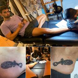 Nach dem Tauchen stellten wir fest, dass wir am nächsten Tag ja noch garnicht abreisten. Irgendwie haben wir zwar Unterkunft & Transfer richtig gebucht, hatten aber vergessen, dass wir noch einen Tag haben und es erst am 06. weiter geht. Da wir nichts spezielles geplant hatten, haben wir den Tag mit einem ausgiebigen Frühstück begonnen und sind zum Dreambeach gefahren. Doch nach 2h brannte die Sonne so arg, dass wir heimfuhren und uns für den Pool entschieden. Ja und was macht man am Ende einer so langen Reise, wenn man Langeweile hat? Richtig. Man geht spontan ins Tattoostudio. Spaß bei Seite und zur Beruhigung an meine Mama/Oma - spontan war es nicht. Aber passiert ist es trotzdem 😉 wir haben uns schon in Thailand, ganz zu Beginn unserer Reise überlegt, ob wir uns eine kleine Erinnerung stechen lassen. Irgendetwas, was nichts mit unserer Beziehung zu tun hat, uns aber trotzdem verbindet und uns vorallem an die unglaublichen Erlebnisse dieser Reise erinnert und das Ergebnis ist… der kleine Kugelfisch Steve, den wir in Thailand bei unserem ersten Tauchgang gefüttert haben! Wir haben uns vorher ein gutes Tattoostudio rausgesucht, dass mit uns ein Design entworfen hat und ihm einen schicken Maori-Stil verpasst hat! Außerdem haben wir eine Stelle rausgesucht, die man gut verstecken kann - also keine Sorge, wir sind nicht wie viele Backpacker besoffen ins nächst-beste Tattoostudio gerannt und haben uns ein 0815 Bali- Tattoo stechen lassen 😅