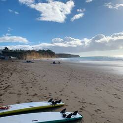 Früh morgens ging es dann zu Fuß an die Surfschule & mit dem Bus an den Strand. Coole Surftshirts gab es auch. Dann ging es los 🏄♀️ 🏄♂️