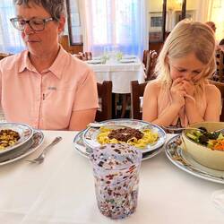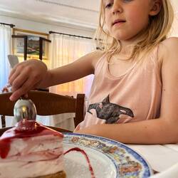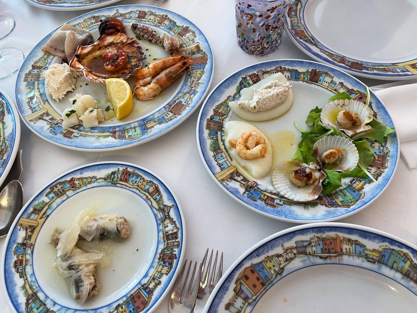 Once back on Burano we hurried over to Il Gatto Nero where we'd booked a table for lunch. Michael and I enjoyed a platter of various seafood items from the lagoon and surrounding waters, and we all shared a plate of fried fish, calamari, shrimps and scampi. Annika picked the dessert out of the desert cabinet. It was some sort of mascarpone mousse with berries. So. Good.