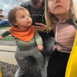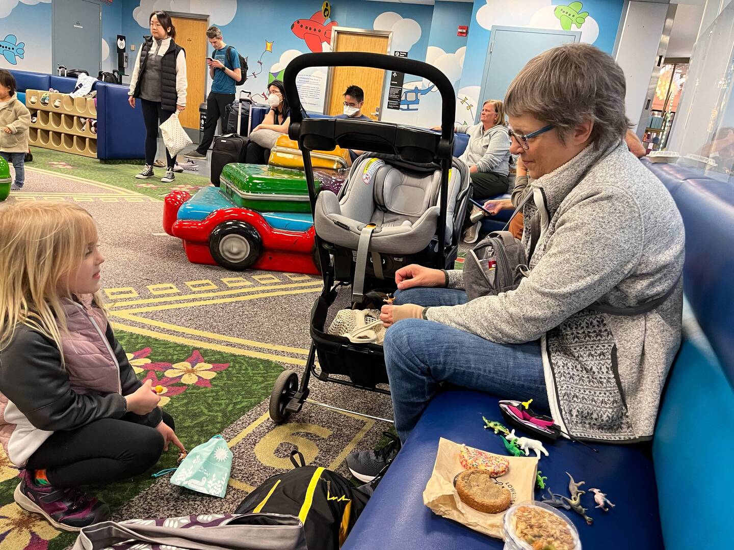 We’re hanging out in the kid zone while waiting to board our flight. Is. Is really into the baby in the mirror. Annika meanwhile is playing with Grandma Julie.
