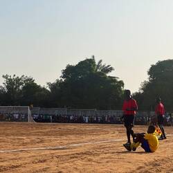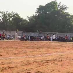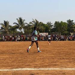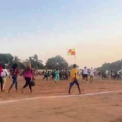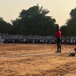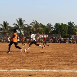 Et puis soudain, il est 16h30, et c’est l’heure d’aller au match !! C’est un match très important, déjà parce que c’est la demi finale et que Boffa est qualifiée en final, il faut découvrir nos ennemis. Mais aussi parce que c’est une coupe politique, organisée par le président arrivé au pouvoir en 2021 par un coup d’état. Le stade est donc rempli de gens !! Ayant été invités personnellement par le maire, nous découvrons que nous avons des sièges réservés (à savoir que tout le monde est debout) à côté des officiels. C’est assez impressionnant et perturbant. On est traité comme des VIP alors que nous n’avons personnellement rien fait pour…