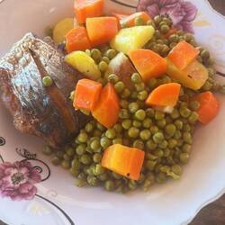 On mange donc tous ensemble, poisson, mélange de carotte / pommes de terre / petits pois, et salade de légumes.