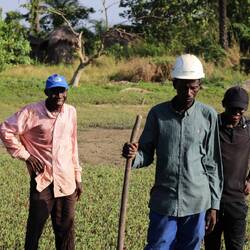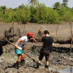 Ici, il est question de creuser à travers la digue pour passer des tuyaux d’évacuation et de trajectoire pour l’eau. L’argile que nous creusons est beaucoup plus malléable que celle de ce matin, mais donc beaucoup plus dense et lourde ! On arrive à poser deux tuyaux et refaire la digue par dessus, avant de terminer notre journée !
