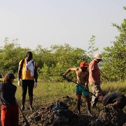 Le travail est physique ! On est sous le soleil, le sable est lourd, et c’est un travail très répétitif. Je me fais assez rapidement une ampoule, jumelle de celles fais pendant la collecte des déchets du marché ! Mais on a la chance de voir le travail avancé concrètement et à vu d’œil ! On déplace tous le sable venu s’étaler dans le marais pour le remonter sur la digue à reconstruire. Ce site là n’a pas été utilisé depuis 5 ans, mais avec cette digue en état, la population sera en mesure de récolter à nouveau du sel pour aller le vendre ensuite.