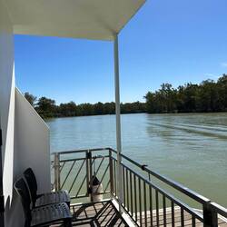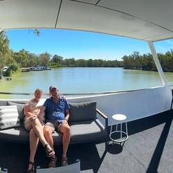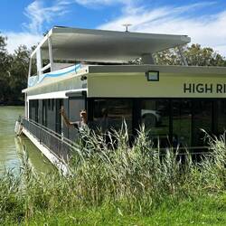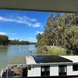 Kym zeigt und das Hausboot mit dem er am Montag mit Gästen 4 Tage durch den Murrey River fährt. Nicht schlecht.. oder?