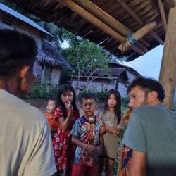אנחנו קוראים ספר, אני משחק עם ילדי הכפר שהביאו לי פירות, פריזבי, ארנבת שחורה (מלווה בשיר לאוסי חמוד ביותר שהם שרים יחד) וקצת גלגלונים ועמידות ידיים.