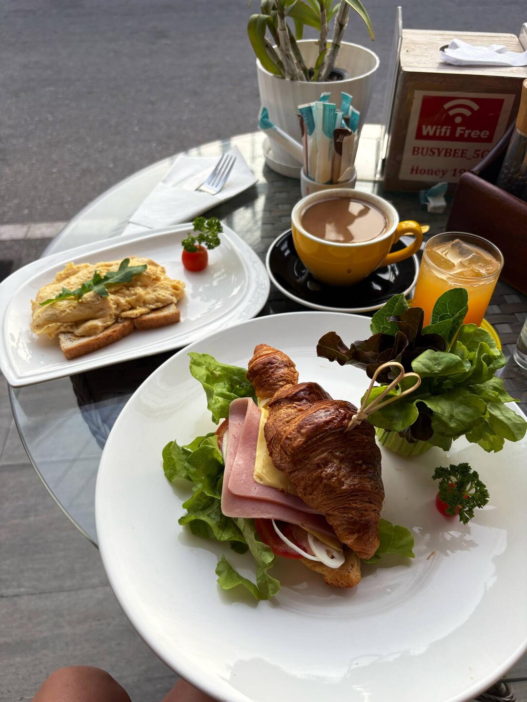 Erstmal lecker gefrühstückt im Café nebenan – Kaffee gut, Welt in Ordnung.