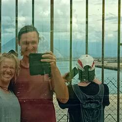Beim Onboarding auf die Fähre werden wie und unser Gepäck durchleuchtet. Das war bei der Anreise nicht so. Ein Wanderer vor uns musste seine Machete abgeben.