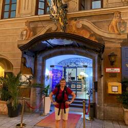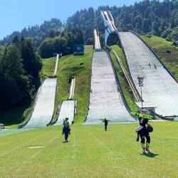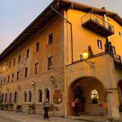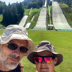 Kingsize Bett, Duschen am Morgen, Frühstück mit Lachs und Sekt - solch ein Luxus für uns Wanderer!😅 Danach „Ortsbegehung“: der alte Stadtkern von Partenkirchen, das OlympiaskisprungstadionBaca lagi