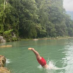 Als wir wieder draußen waren ging die Tour noch weiter und wir haben uns aufgeblasene Autoreifen geholt und uns den schnellen Fluss Abwärts treiben lassen. Und der ist im Gegensatz zu der Höhle und den Becken von Semuc schon kälter. Auf dem Weg dorthin war noch diese Schaukel, die 10 Meter hoch befestigt war und man konnte ewig weit durchschwingen. Von einer Höhe von 4 Meter musste man dann abspringen weil wenn du wieder zurückschaukelst dann ist vorbei, weil du gegen einen der Pfosten knallst.