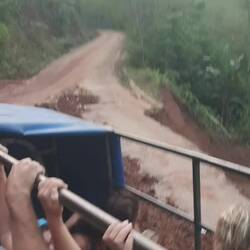 Zur Höhle mussten wir 10 Min hingehen und auch die Brücke über den Fluss passieren. Dort zur Brücke geht eine steile Schotterstraßen runter und zu Fuß war es schon rutschig. Auf einmal kommt von oben ein mit Menschen voll beladener Transporter. Auf der Ladefläche standen sie alle und ich hab mir nichts dabei gedacht. Ich dreh mich um und geh weiter. Dann eine Sekunde später fangen hinter mir die Leute von meiner Gruppe an zu schreiben und ich hör nur dasss hinter mir was passiert. Ich dreh mich wieder um und seh den Transporter auf mich zu zu schlittern. Die Vorderachse und die Reifen waren blockiert und standen quer und der Transporter ist unkontrolliert schneller geworden.