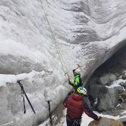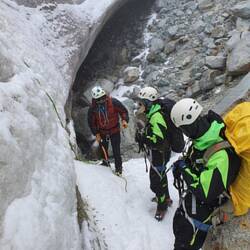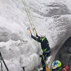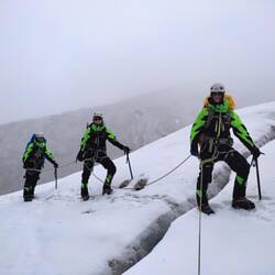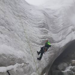 Wir sind circa eine Stunde zum Gletscher marschiert und dort haben wir dann gelernt, welche Techniken es gibt, den Berg zu erklimmen. Immer mit drei festen Standbeinen (beide Beine + Eispickel) sichert man seinen Halt und bewegt dann den Fuß oder den Eispickel nach vorne. Jeder Schritt mit Vorsicht. Wie man mit einem Sicherungsseil zwischen uns umgeht haben wir auch gelernt. Immer auf Spannung und mit einer Hand festhalten.