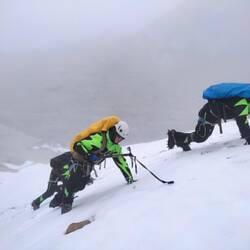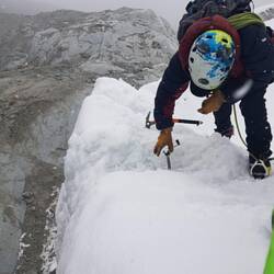Mit dem Taxi haben wir circa 1,5 Stunden bis zum ersten Basecamp gebraucht. Hier sind wir jetzt auf 4.700 Metern. Die Nacht werden wir hier verbringen und von hier aus auch heute zum Üben zum Gletscher aufbrechen. Wir haben noch Mittagessen davor bekommen und danach gings los. Wir haben unsere Montur angezogen und waren komplett eingepackt. Wir haben die extra Schnerschuhe, in denen man relativ schwer gehen kann, aber wir brauchen sie für die Steigeisen und die Eiswand. Später haben wir dann noch Helm, Kletterausrüstung angelegt.