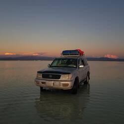 Danach ging es voll beladen los. Ab in die Salzwüste! Die Landschaft ändert sich schnell und auf einmal fahren wir auf einer schmalen Salzstraße durch die Salzwüste. Die Salzwüste ist mit einer 10 Zentimeter tiefen Wasserschicht bedeckt, was ich zuerst gar nicht verstanden hatte. Während der Regenzeit ist die Wüste nämlich gar nicht trocken, sondern mit Regenwasser überflutet. Es sieht absolut surreal aus. Endlose Weiten sieht man eine ruhige Oberfläche, worin sich Himmel und Sonne spiegeln.