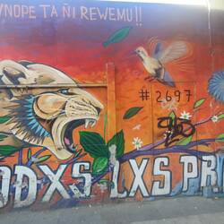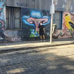 Gegen 17 Uhr sind wir zum Stadtviertel Yungay gefahren, wo wir am Tag davor eigentlich eine Freewalkingtour machen wollten, aber wegen dem Raub sie ausgefallen lassen haben. Das Stadtviertel ist bekannt für Graffitikunst und tolle Wandmalereien. Auch politische Statements sind hier viele zu finden. Santiago ist nämlich durchaus eine sehr impulsive Stadt, wenn es um Proteste und Gerechtigkeit geht. Alle Jahre gibt es immer wieder große Demonstrationen gegen die Regierung. Bei den letzten Demos 2019 sind viele Menschen getötet worden. In der Stadt sind die Fesnter von allen Polizeifahrzeugen mit Gittern beschlagen. Tausende Dellen lassen auf viele Flaschen- oder Steinwürfe auf das Auto schließen.