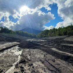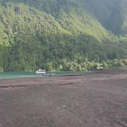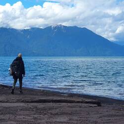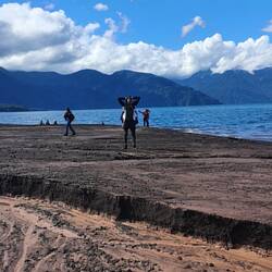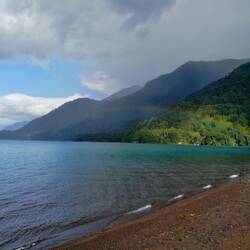 Die letzten 500m zum See hat uns dann ein Minibus mitgenommen. Eigentlich hätten wir das noch selber laufen können.. Der See war auch der Hammer mit dem Gebirge im Hintergrund! Wir haben unsere Füße im Wasser abgekühlt und gemütlich die Natur aufgenommen. Es gibt hier sogar Vulkansand, der vom Vulkan das Flussbett runtergespült wird. Einfach tolle Kulisse mit Vulkan, dem blauen Wasser, den Bergen und so weiter. Coole Sache war auch der Regenbogen, den wir im vollen Bogen bewundern konnten.