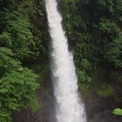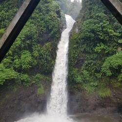 Wenn du auf den Wasserfall zuschwimmst drängt die Ströming und auch der entstehende Windwirbel dich richtig zurück. Ich hab dort dann einem Kanadier und einen Costa Ricaner kennengelernt und mir gesagt haben, dass es noch einen zweiten und einen dritten Wasserfall gibt, aber der Weg dorthin ist anstrengender und gefährlicher. Und es ging wirklich dann steil bergauf und du hast dich an Wurzeln und befestigten Tauen festgehalten auf dem Weg nach oben. Abendteuerlich! Nen Ausrutscher darfst dir nicht erlauben.
