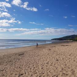 Der Sand vom Strand ist schwarz wegen den ganzen Vulkanen und im Hintergrund hast du die Strandpromenade mit grünen Palmen und dahinter die weitentfernten Vulkane. Die Wellen sind 2-3 Meter hoch und laden zum Surfen ein. Sie brechen schon ganz weit draußen weil die ersten 150m das Wasser nur brusthoch ist. Ich Vollgas in die Wellen gestürzt und die haben mich ganz schön zerwirbelt aber Spaß hats gemacht geil!