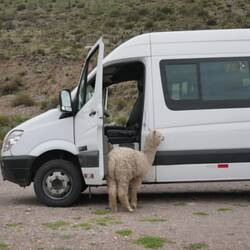Bevor wir weiter gefahren sind, hat sich jeder noch eine kalte Cola gezischt und danach gings zum nördlichsten Punkt Südamerikas. Im Jeep sind die Sitzplätze eigentlich alle voll in Ordnung. Ganz hinten im Jeep ist es ein bisschen unbequemer, aber da ich gestern die meiste Zeit hinten gesessen bin, konnte ich heute den ganzen Tag in der Mitte rechts sitzen und hab Videos mit meiner Kamera gemacht. Nach 1h Fahrt hatten wir noch einen kleinen Halt beim Mirador (Ausblick), wo dann des Gruppenfoto entstanden ist und auch zwei, vom Wüstenstaub ganz verzottelte Hunde waren.
