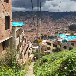 Anschließend bin ich zum weißen Kreuz von Cousco hochgegangen. Dort sollte man eine gute Aussicht auf die Stadt haben. 45 Minuten Treppen steigen durch die "Favelas" von Cousco, wobei Cousco als eine der sichersten Städte Perus gilt. Deswegen ziehen auch viele Peruaner hierhin und inzwischen Leben 480.000 Menschen hier. Die Treppenstufen hoch bin ich ganz schön ins Schnaufen bekommen. Kein Wunder bei 3.600m über Null.