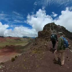 Wir waren zuerst auf dem kleinen Plateau, wo man Treppen hochsteigen musste. Die Perspektive mit der 360°-Kamera wird geil glaub ich! Der andere Mirsdor war gleich daneben und hier ist jetzt auch mein neuer Höhenrekord: 5.069 Meter. Wir haben uns alle 5 erstmal hingesetzt und den Ausblick sacken lassen. Versucht so viel wie möglich aufzunehmen. Die Weite ins Tal. Das surreale Rot der Berge und das Grün.