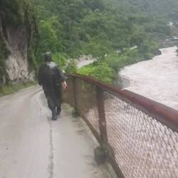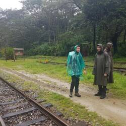 Wir sind dann gegen 13 Uhr am Hydroelectrica angekommen und dann in einer 6er Gruppe los marschiert. Vasel hat sich erstmal eine Weghalbe gekauft und in guter Stimmung gings los. Die Landschaft und die Kulisse war mal wieder bombastisch. Hohe Berge, verregneter Regenwald und die Eisenbahnschienen, die sich durch das Tal bahnen. Bei der grünen Brücke haben wir dann ein Fotoshooting gemacht. Danik ist auch ein Hobbyfotograf und so haben wir immer nach den besten Motiven gesucht.