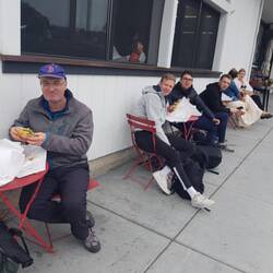Mit dem Radl haben wir über die Brücke passiert. Auf der anderen Seite haben wir uns unterhalb der Brücke am Ufer gehalten und sind nach Sausalitos gefahren. Dort hat unsere hervorragende Tour mit Bill geendet. Er hat uns noch was empfohlen, wo wir Mittag essen können. Wir fallen nämlich inzwischen wirklich alle vom Fleisch. Wir brauchen jetzt echt was! Problem sind tatsächlich auch die Preise in den USA. Eine kleine Pizza kostet in einem normalen Restaurant minimum 18-28$. Eher mehr. Deswegen haben wir uns für ein super Sandwich entschieden, dass zwar immer noch 12$ gekostet hat, aber verdammt gut war. Hatten alle des gleiche^^ Beweisefoto bei den roten Stühlen.