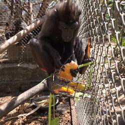 Zuerst füttern wir die ganzen Affen in den Socialzing Cages - Früchte durch Gitterstäbe zu drücken durchnässt irgendwannLes mer
