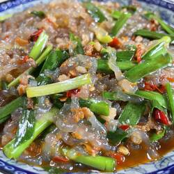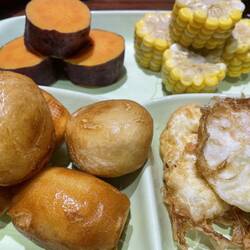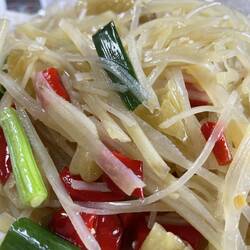 Gelbes Huhn mit Kartoffeln und Frühlings Zwiebeln, Bambusgemüse mit Karotten, Schweinefleisch mit Knoblauch Sprossen, und gemischtes Gemüse.... 很好吃 😋!