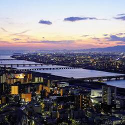 Jetzt aber flott! Wir wollen noch vor dem Sonnenuntergang am Umeda Sky Building ankommen. Verspätete Bahnen (und das in Japan! 😉), permanent rote Ampeln und Warteschlangen scheinen das Vorhaben zu vereiteln. Mit dem letzten Lichtstrahl erreichen wir die Aussichtsplattform. Die Aussicht ist grandios. Es ist nur ziemlich voll dort oben.