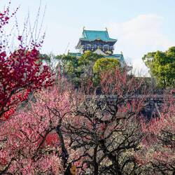 Mittlerweile ist es kurz nach zwei. Wenn wir uns heute noch was anschauen wollen, müssten wir jetzt los. Wir fahren mit der Bahn zum Ōsaka Castle. Dort gibt es einen Pflaumenhain, der gerade in den Farben weiß bis dunkelpink blüht. Die Sonne scheint und sehr viele Leute sind zum Fotoshooting erschienen. Es macht viel Spaß, die Leute beim fotografiert werden zu fotografieren. Zumal sie sich richtig in Schale geschmissen haben. Uns reicht es heute, das Castle von außen anzuschauen. Anschließend gibt es für uns noch eine ungenießbare Frankfurter Wurst (man sollte nicht voraussetzen, dass es schmeckt wie zu Hause) und einen Kaffee bei Starbucks. Bei denen macht man geschmacklich nichts falsch.