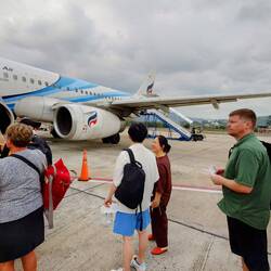 Nach Koh Samui fliegt man ca. eine Stunde. Die Flugbegleiterinnen von Bangkok Air geben sich alle Mühe, den Gästen in dieser Zeit ein warmes Essen zuzuwerfen und kurz danach das Tablett wieder zu entreißen. Hier geht es um Sekunden. Übrigens schmeckt das Essen am Bord gar nicht so schlecht. Es gibt Nudeln mit Hühnchen. Mein Zahn signalisiert mir, dass er explodieren möchte. Die Druckschwankungen in der Kabine sind ihm vermutlich zu viel.