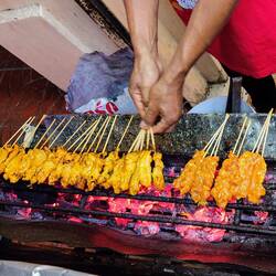Nach dem Einchecken wollen wir gleich etwas gegen das kleine Hüngerchen tun. Nachtmarkt? Na los. Es ist allerdings gar nicht so einfach, auf den Food Market, den wir fälschlicherweise für den Nachtmarkt gehalten haben, zu kommen. Man muss zunächst durch eine Straße, auf der abends hunderte Verkäufer ihre Buden aufgebaut haben und gern ihre Souvenirs verkaufen wollen. Es ist wirklich gruslig, sich durch dieses Stop and go bewegen zu müssen. Alles voll mit Touristen, die nur mal schauen wollen.